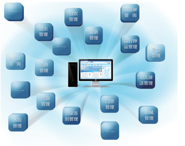 系統(tǒng)以一卡通管理系統(tǒng)為核心,通過網(wǎng)絡(luò)連接各功能模塊構(gòu)成系統(tǒng)的基本框架,由于系統(tǒng)按模塊設(shè)計,可根據(jù)管理和發(fā)展的需要量體裁衣,分步實施,任意增減功能和擴(kuò)充規(guī)模。